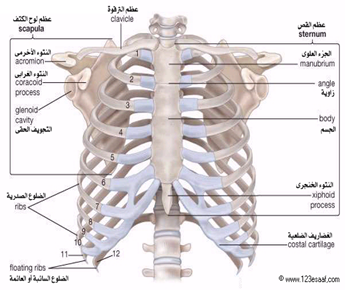 أما القفص الصدري (chest or rib cage) فيتكون من 25 عظمة وهي عظمة القص Sternum)) وعظمات الضلوع (ribs) وعددها 24 عظمة والتي تأتي على شكل أزواج. فعظمة القص من العظام المسطحة يبلغ طولها 17 سم ولها شكل يشبه الخنجر يسمى الجزء العلوي منه يد القص (manubrium) وهي مضلعة الشكل يوجد في رأسها ثلم كبير يمكن إحساسه باليد. ويلي يد القص جزء منتظم يسمى جسم القص (Gladiolus) ومن ثم الجزء السفلي المسمى بالنتوء الخنجري (xiphoid process) وهو أقل عرضا من جسم القص ومكون من مادة غضروفية تتحول إلى عظم مع تقدم العمر. وتتمفصل عظمتا الترقوة (Clavicle) مع يد عظمة القص عند نهايتها العليا من خلال المفصل القصي الترقوي (Sternoclavicular Joint ) وهو مفصل غضروفي متين يسمح بحركة محدودة جدا للترقوة لامتصاص الصدمات. وتقوم يد عظمة القص بحماية قوس الشريان الأورطي والشرايين المتفرعة منه بينما يحمي جسمها القلب والقصبة الهوائية. أما الضلوع فعددها إثني عشر زوجا منها سبعة أزواج حقيقية (true ribs) وخمسة أزواج كاذبة (false ribs) من حيث اتصالها أو عدم اتصالها بعظمة القص. وعظمات الضلوع مكونة من أربعة أجزاء وهي الرأس والعنق والحدبة والجسم فالجسم الذي يشكل معظمها مكون من عظم مسطح وأشكالها نصف دائرية ويتراوح متوسط أطوالها بين 12 سم و 24 سم بينما يبلغ متوسط عرضها 2سم. وتتمفصل الضلوع جميعها من الخلف مع جوانب الفقرات الصدرية الإثني عشر أما من الأمام فتلحم سبعة أزواج من الضلوع وهي الأزواج العليا بشكل مباشر بيد وجسم عظمة القص من خلال الغضاريف الضلعية (costal cartilages) وثلاثة أزواج منها بشكل غير مباشر من خلال غضاريف تلتحم بغضاريف الأزواج الحقيقية بينما لا يلتحم الزوجان السفليان بعظمة القص وتترك رؤوسها سائبة ولذا تسمى الضلوع العائمة أو السائبة (floating ribs). ويكون كل زوج من الأضلاع بعد تمفصلها مع العمود الفقري وعظمة القص أشكال دائرية تبدأ بقطر صغير عند الضلع الأول ثم تزداد تدريجيا إلى أن تصل إلى أكبر قطر عند الضلع السابع ثم تبدأ بالتناقص تدريجيا لبقية الضلوع. وترتبط الضلوع ببعضها البعض بعضلات رقيقة تسمى العضلات الوربية تعمل عند انقباضها وانبساطها على توسيع وتضيق القفص الصدري لكي تتمكن الرئتان من إجراء عملية الشهيق والزفير. وبهذا الترتيب فإن الضلوع تكون مع العمود الفقري من الخلف وعظمة القص من الأمام ما يشبه القفص يحتوي في داخله الأعضاء المهمة وهي القلب والرئتان والشرايين والأوردة الرئيسية والمريء والقصبة الهوائية.